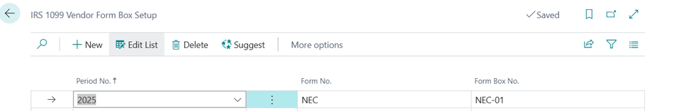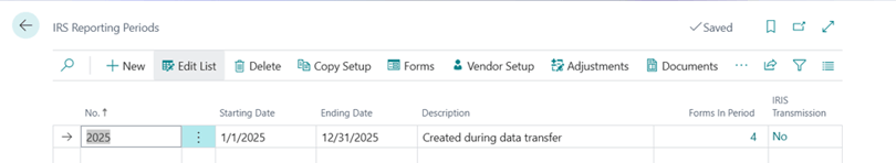 Business Central now requires you to set up a new IRS reporting period every year. During the upgrade, your 2025 reporting period and vendor data were automatically migrated. Moving forward, you’ll need to repeat this setup annually to ensure accurate 1099 tracking.