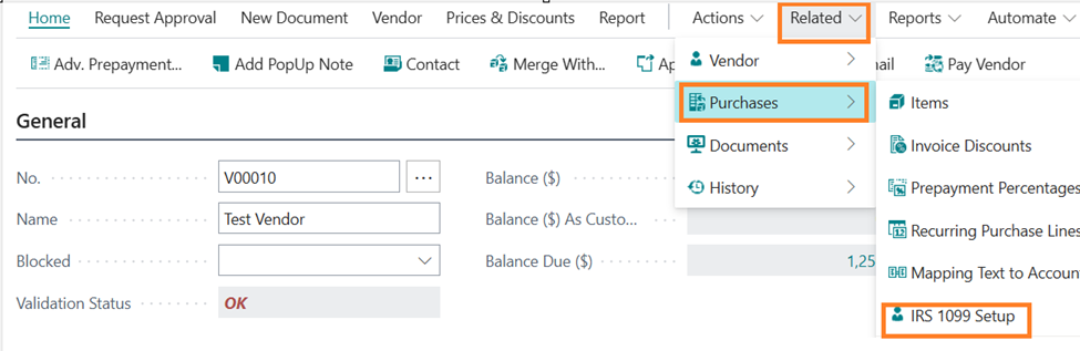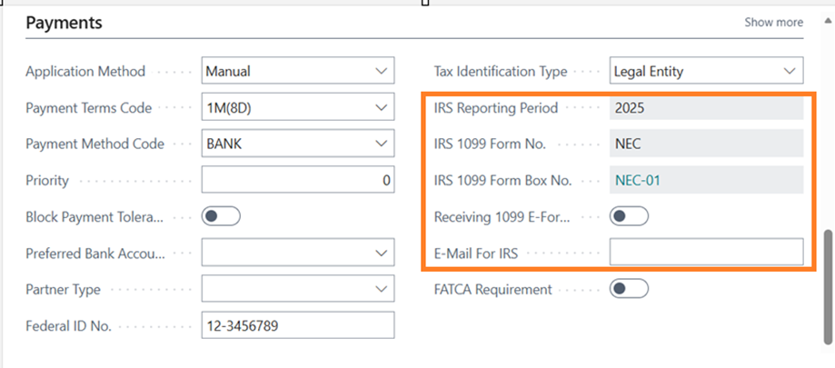 When adding a new vendor, Business Central will not assign 1099 details automatically. You’ll need to manually set up their 1099 information, so payments are tracked correctly for the year.